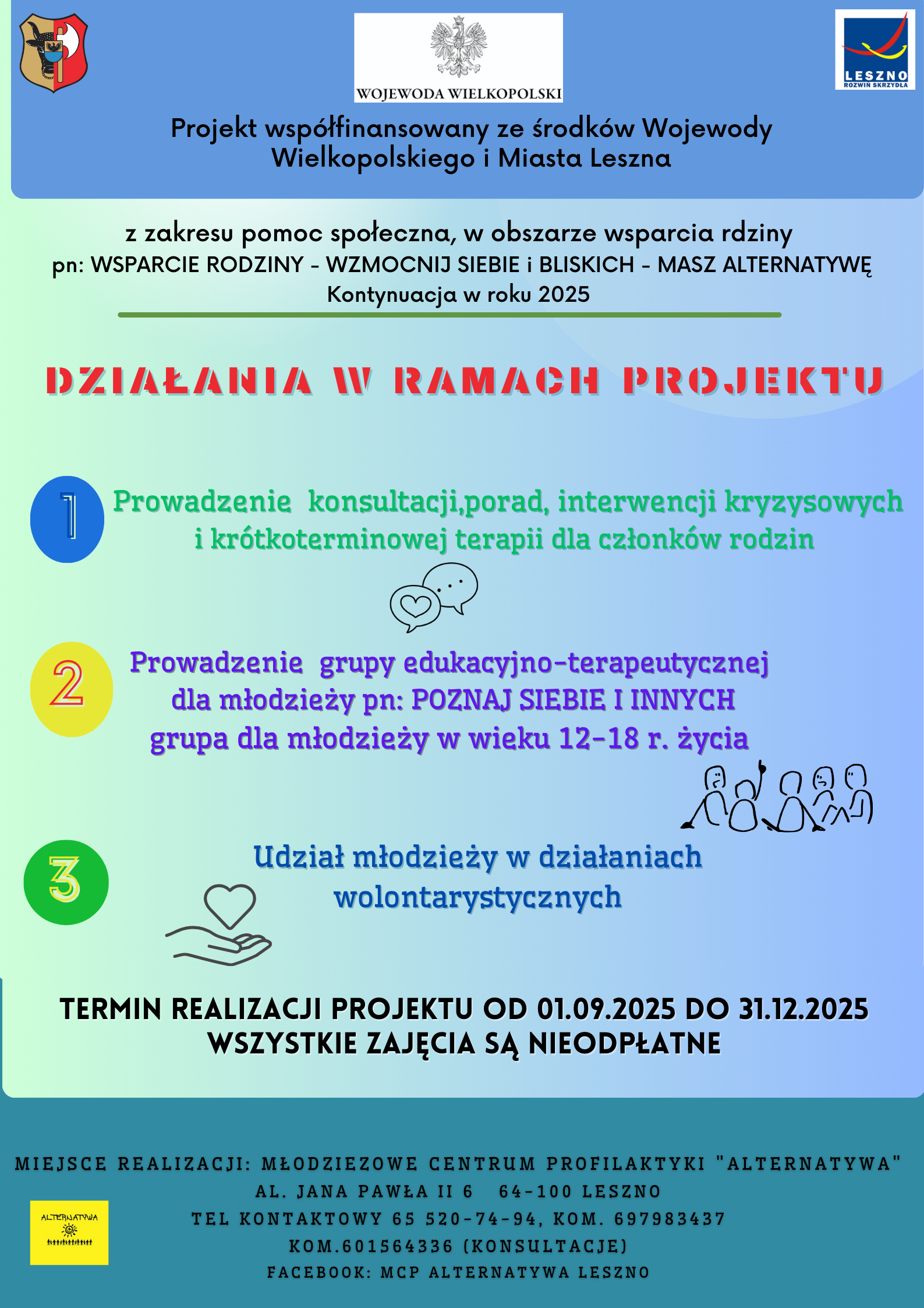 Młodzieżowe Centrum Profilaktyki „Alternatywa” informuje o możliwości kierowanie młodych osób w wieku 11- 18 lat na zajęcia nowo utworzonej grupy Poznaj siebie i innych, które odbywają się w czwartki w godzinach od 15.30 do 18.00. Prowadzimy również rozmowy wstępne z …