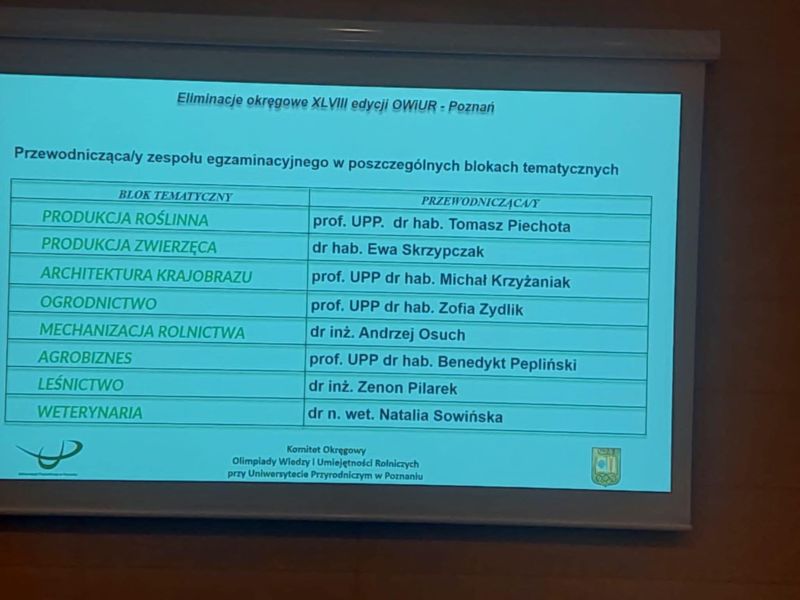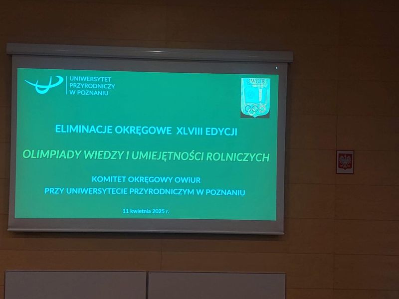 W piątek 11 kwietnia br. na Uniwersytecie Przyrodniczym w Poznaniu odbyły się eliminacje okręgowe Olimpiady Wiedzy i Umiejętności Rolniczych. Naszą szkołę reprezentowało czternaścioro uczniów siedmiu blokach tematycznych, mianowicie: Maksymilian Kubacik, Ksawery Ławniczak, Adam Marach i Martyna Rzyska w bloku Agrobiznes, Antonina Chodorowska w bloku Architektura krajobrazu, Sambor Chudy i Mateusz Galon w bloku Mechanizacja rolnictwa, Tobiasz Humski i Alisa Sheremetova w bloku Ogrodnictwo, Marek Samol w bloku Produkcja roślinna, Michał Nowak w bloku Produkcja zwierzęca oraz Marcelina Woźniak, Błażej Gleń i Jakub Nadolny w bloku Weterynaria. O rezultatach zmagań, czyli o osobach zakwalifikowanych do etapu centralnego dowiemy się 17 kwietnia 2025 roku.
