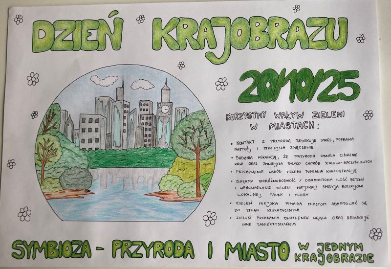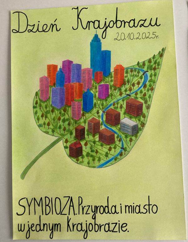 Jak co roku, również i w tym w naszej szkole nie mogło zabraknąć obchodów „Dnia Krajobrazu”. Z tej okazji został zorganizowany konkurs na plakat promujący to międzynarodowe już święto, które zostało zainicjowane w Polsce przez Generalną Dyrekcję Ochrony Środowiska. Tegoroczne hasło obchodów Dnia Krajobrazu brzmiało: „Symbioza – Przyroda i Miasto w jednym Krajobrazie!”. Spośród otrzymanych prac wybrano trzy nagrodzone miejsca: