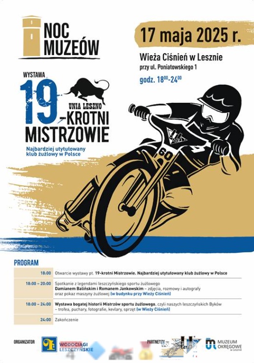 18:00 – 24:00 w Wieży Ciśnień wystawa bogatej historii Mistrzów sportu żużlowego, czyli naszych leszczyńskich Byków – trofea, puchary, fotografie, kevlary, sprzęt