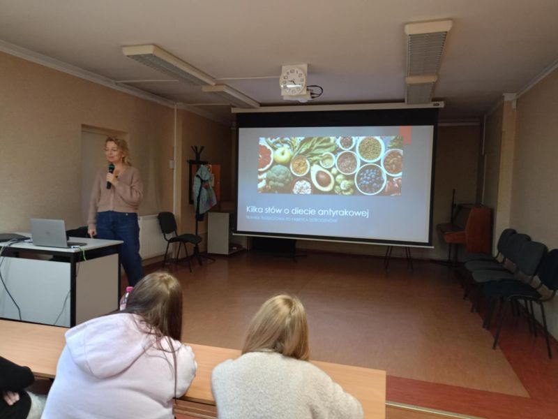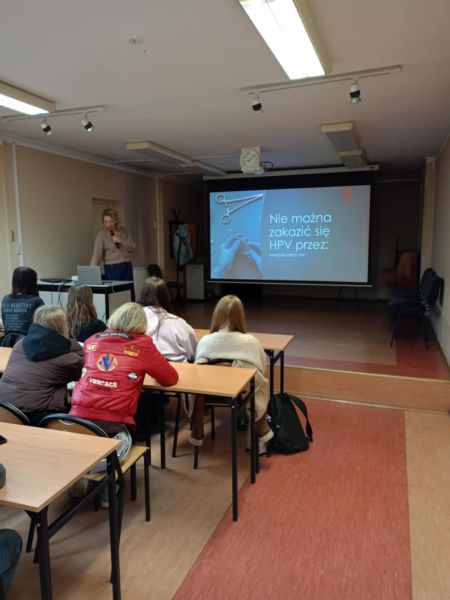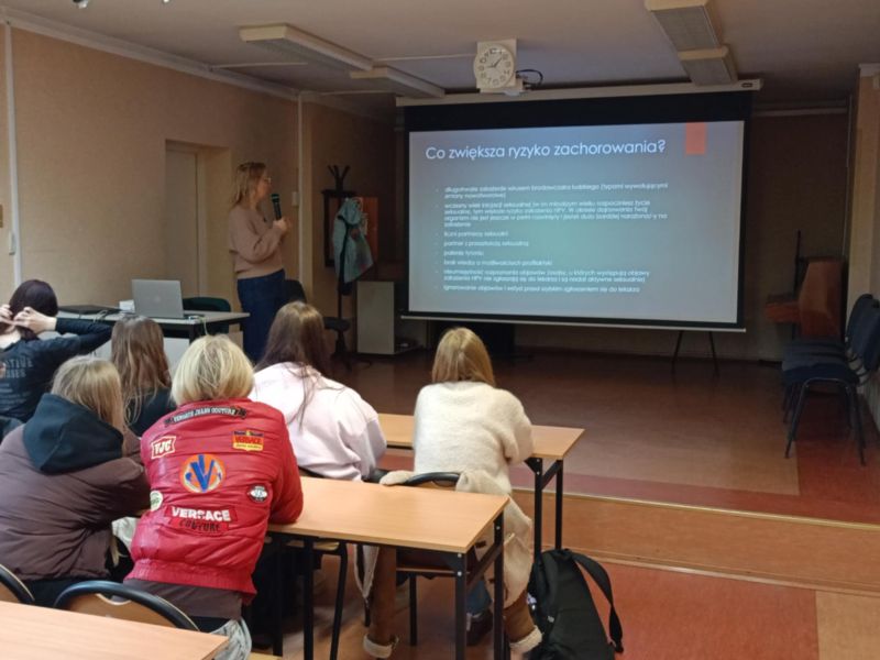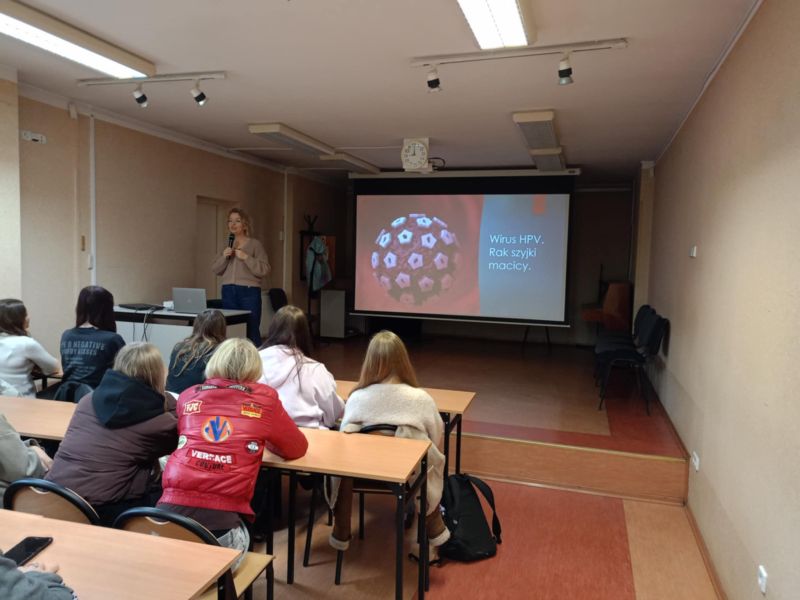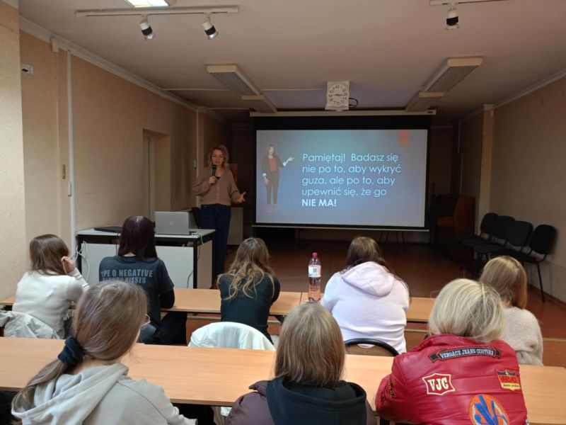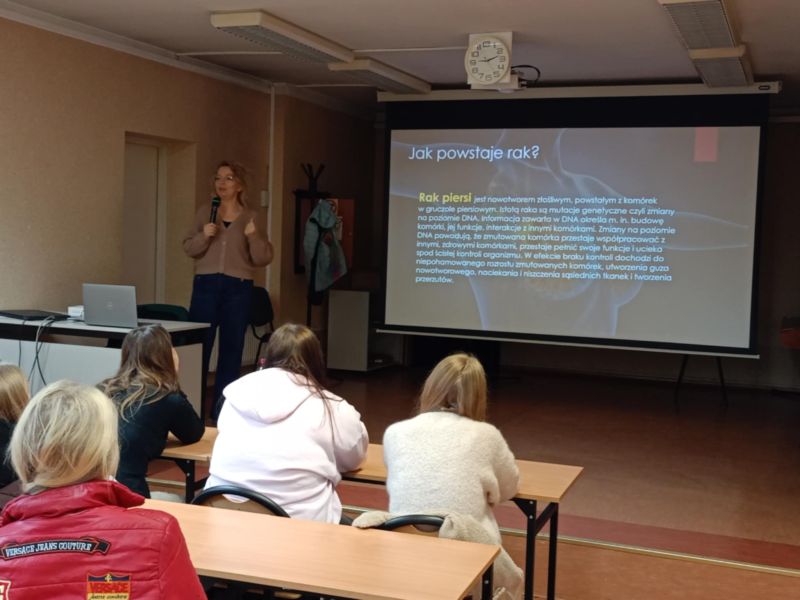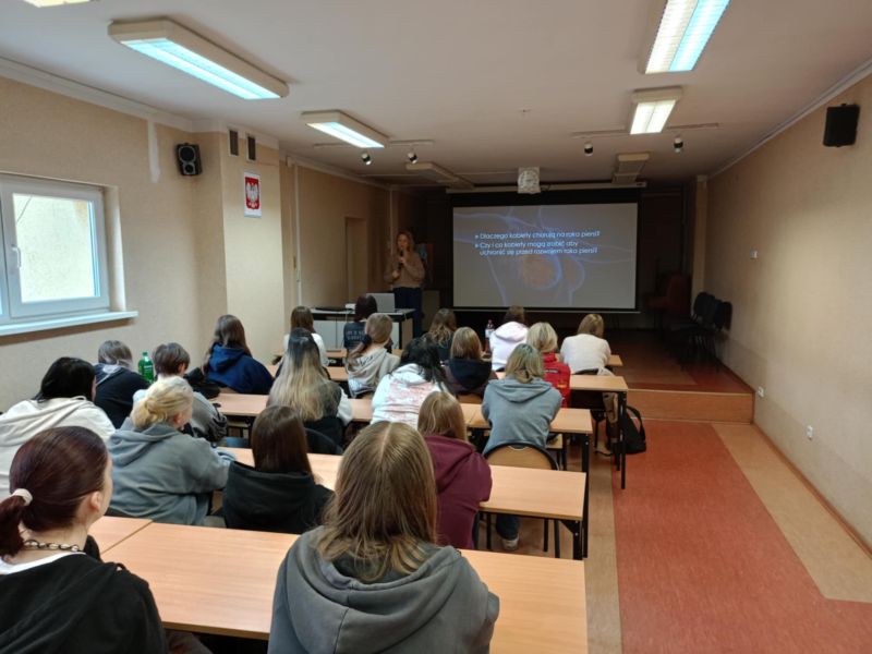 Rak piersi to najczęściej występujący nowotwór złośliwy wśród kobiet w Polsce. Z tego też powodu 14.11.2025 r. na zaproszenie Samorządu Uczniowskiego gościła pani Anna Ślusarek z Powiatowej Stacji Sanitarno – Epidemiologicznej w Lesznie, która przeprowadziła bardzo interesującą prelekcję. W Polsce co roku diagnozuje się ponad 18.500 nowych przypadków raka piersi, a dane wskazują na stały wzrost zachorowań. Ta liczba zatrważa. Prelegentka przedstawiła jak wygląda pierś z nowotworem, jak szybko rośnie guz, w jaki sposób należy się badać i do jakiego specjalisty się udać. Bardzo szczegółowo omówiła także wirus HPV, inaczej wirus brodawczaka ludzkiego. Przenoszony jest głównie drogą płciową. Istnieje ponad 200 jego typów, z których niektóre są łagodne, a inne z kolei wysokoonkogenne i mogą prowadzić do rozwoju nowotworów, takich jak rak szyjki macicy. Pani Anna Ślusarek podkreśliła, iż wirus HPV nie dotyczy tylko kobiet czy dziewcząt. Może zagrażać także mężczyznom. Co więcej nie da się go całkowicie wyeliminować z organizmu, a zakażenie może długo pozostać niezauważone. W spotkaniu uczestniczyły klasy III TAA, III TAB i III TŻ. Po skończonej prelekcji młodzież miała okazję przećwiczyć badanie wykrywania nowotworu. Wykład okazał się bardzo owocny i z pewnością rozjaśnił wiele problematycznych kwestii.